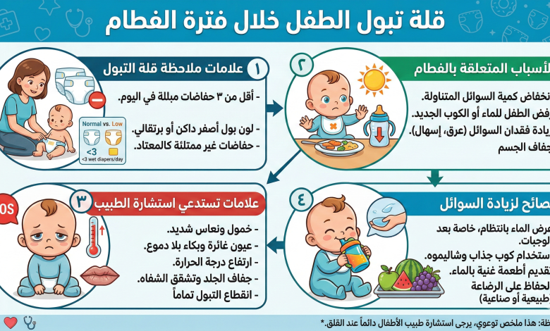 و في حال استمرار قلة البول او حدوث انقطاع البول لأكثر من 6 ساعات فيجب مراجعة طبيب الاطفال